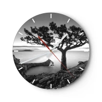 Väggklocka - Klocka på glas - Ett träd på en klippa med utsikt över havet i svartvitt - 30x30cm - Ro enda fram till horisonten - Modern väggdekoration för vardagsrum, kök och sovrum ARTTOR