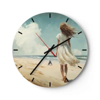 Väggklocka - Klocka på glas - En kvinna i vit klänning som går barfota på stranden - 30x30cm - Att möta solen och vinden - Modern väggdekoration för vardagsrum, kök och sovrum ARTTOR