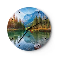 Väggklocka - Klocka på glas - Berglandskap med sjö och skog - 30x30cm - Höstens mildhet - Modern väggdekoration för vardagsrum, kök och sovrum ARTTOR