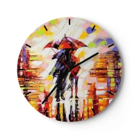 Väggklocka - Klocka på glas - Ett par under ett rött paraply mot en färgglad, målerisk bakgrund - 30x30cm - Tillsammans genom natten och regnet - Modern väggdekoration för vardagsrum, kök och sovrum ARTTOR