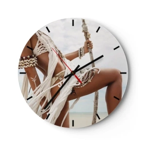 Väggklocka - Klocka på glas - En stiliserad figur i etniska smycken mot en strandbakgrund. - 30x30cm - Solens prästinna - Modern väggdekoration för vardagsrum, kök och sovrum ARTTOR