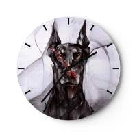 Väggklocka - Klocka på glas - Porträtt av en doberman i modern geometrisk stil - 30x30cm - Rasren - Modern väggdekoration för vardagsrum, kök och sovrum ARTTOR