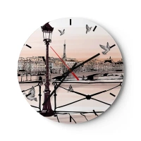 Väggklocka - Klocka på glas - En lykta, duvor och panorama över Paris vid solnedgången - 30x30cm - Över Paris tak - Modern väggdekoration för vardagsrum, kök och sovrum ARTTOR