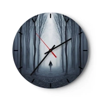 Väggklocka - Klocka på glas - En mörk skog i dimman med en mystisk figur - 30x30cm - Och allt är enkelt och klart - Modern väggdekoration för vardagsrum, kök och sovrum ARTTOR
