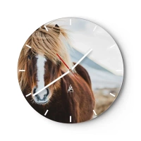 Väggklocka - Klocka på glas - En brun häst med en ljus man mot ett bergslandskap - 30x30cm - Känner du friheten? - Modern väggdekoration för vardagsrum, kök och sovrum ARTTOR