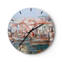 Väggklocka - Klocka på glas - En pastellfärgad hamn med båtar mot bakgrund av pittoreska byggnader - 30x30cm - Pastellfärgad semester - Modern väggdekoration för vardagsrum, kök och sovrum ARTTOR