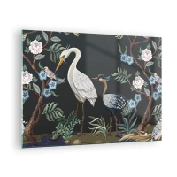 Glastavla - Bild på glas - Färgglada fåglar bland blommande grenar mot en mörk bakgrund - 70x50cm - Fågelparad - Modern väggdekoration för vardagsrum och sovrum ARTTOR