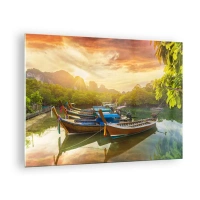 Glastavla - Bild på glas - Traditionella båtar i ett tropiskt landskap vid solnedgången - 70x50cm - Före en arbetsam dag - Modern väggdekoration för vardagsrum och sovrum ARTTOR