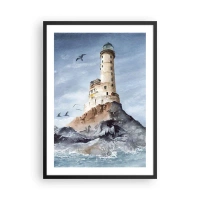 Affisch i svart ram - En akvarellmålning av en fyr på en klippig kust - 50x70cm - Oövervinnelig - Modern väggdekoration för vardagsrum och sovrum ARTTOR
