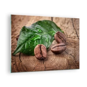 Glastavla - Bild på glas - Kaffebönor på ett blad och träbakgrund - 70x50cm - Äkta och svart - Modern väggdekoration för vardagsrum och sovrum ARTTOR
