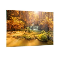 Glastavla - Bild på glas - Skogkaskad i gult - 120x80 cm