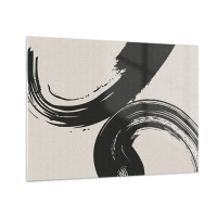 Glastavla - Bild på glas - Svarta, dynamiska kalligrafiska penseldrag mot en ljus bakgrund. - 70x50cm - Svepande och cirkulärt - Modern väggdekoration för vardagsrum och sovrum ARTTOR