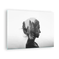 Glastavla - Bild på glas - En kvinna i svartvitt med ett barrskogsmotiv ovanpå - 70x50cm - Furuskogens härskarinna - Modern väggdekoration för vardagsrum och sovrum ARTTOR