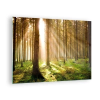 Glastavla - Bild på glas - Solstrålar som tränger igenom träden i skogen - 70x50cm - Snart kommer alverna - Modern väggdekoration för vardagsrum och sovrum ARTTOR