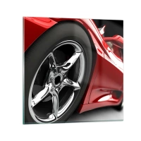 Väggklocka - Klocka på glas - Närbild av kromfälgarna på en röd bil - 30x30cm - Skapad att vara snabb - Modern väggdekoration för vardagsrum, kök och sovrum ARTTOR