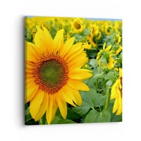 Canvastavla - Bild på duk - Ett fält av solrosor med gula blommor mot en bakgrund av gröna blad - 70x50cm - Hundratals brinnande solar - Modern väggdekoration för vardagsrum och sovrum ARTTOR