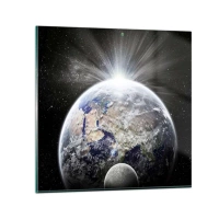 Väggklocka - Klocka på glas - Vy över jorden vid soluppgången i yttre rymden - 30x30cm - I fullt sken - Modern väggdekoration för vardagsrum, kök och sovrum ARTTOR
