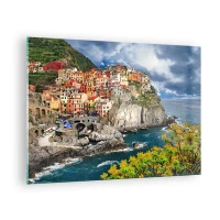 Glastavla - Bild på glas - En färgglad stad på en klippa vid havet - 70x50cm - I bergets famn - Modern väggdekoration för vardagsrum och sovrum ARTTOR