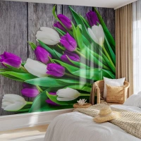 Fototapet Standard Eco - En bukett vita och lila tulpaner på trä - 100x70cm - På vårdagen - Modern väggdekoration för vardagsrum och sovrum ARTTOR