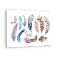 Glastavla - Bild på glas - Färgglada fjädrar i konstnärlig stil på vit bakgrund - 70x50cm - Lätta, färgglada och färgrika - Modern väggdekoration för vardagsrum och sovrum ARTTOR