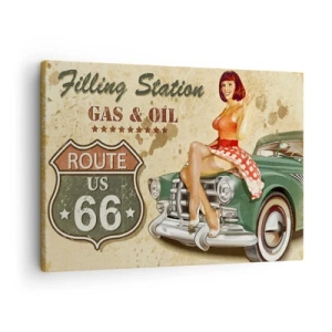 Canvastavla - Bild på duk - Retro Route 66-affisch med pinuppa och bil - 70x50cm - Underbara 40-talet - Modern väggdekoration för vardagsrum och sovrum ARTTOR
