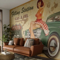 Fototapet Standard Eco - Retro Route 66-affisch med pinuppa och klassisk bil - 100x70cm - Underbara 40-talet - Modern väggdekoration för vardagsrum och sovrum ARTTOR