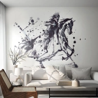 Fototapet Standard Eco - Svartvit illustration av en riddare till häst i dynamisk rörelse - 100x70cm - Svart riddare - Modern väggdekoration för vardagsrum och sovrum ARTTOR