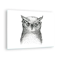Glastavla - Bild på glas - Illustration av en uggla som bär hjärtformade glasögon - 70x50cm - Klokt och med kärlek - Modern väggdekoration för vardagsrum och sovrum ARTTOR