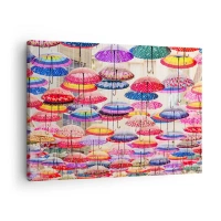 Canvastavla - Bild på duk - Färgglada paraplyer svävande i luften - 70x50cm - Stadsäng - Modern väggdekoration för vardagsrum och sovrum ARTTOR