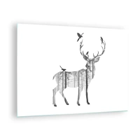 Glastavla - Bild på glas - Grafisk silhuett av en hjort med skogsmotiv och fåglar - 70x50cm - Skogens goda ande - Modern väggdekoration för vardagsrum och sovrum ARTTOR