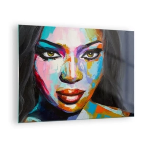 Glastavla - Bild på glas - Ett färgstarkt porträtt av en kvinna i en distinkt stil - 70x50cm - Kan inte ta ögonen från henne - Modern väggdekoration för vardagsrum och sovrum ARTTOR