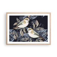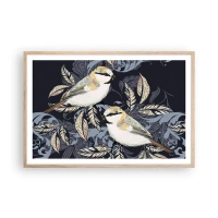 Affisch i ram av ljusek - Gul-grå fågelsång - 100x70 cm