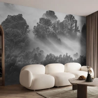 Fototapet Standard Eco - En svartvit skog höljd i dimma med ljusstrålar - 100x70cm - Stiger ur sömnen - Modern väggdekoration för vardagsrum och sovrum ARTTOR