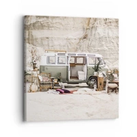 Glastavla - Bild på glas - En husbilsinredning i ökenmiljö, med bohemiska och naturinslag. - 70x50cm - Dags att börja resan - Modern väggdekoration för vardagsrum och sovrum ARTTOR