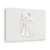 Glastavla - Bild på glas - En minimalistisk skiss av en kvinnas händer och läppar mot en beige bakgrund. - 70x50cm - Drömstund - Modern väggdekoration för vardagsrum och sovrum ARTTOR