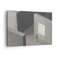 Canvastavla - Bild på duk - En figur i en labyrint som tittar på en hängande karta - 70x50cm - Men var är jag? - Modern väggdekoration för vardagsrum och sovrum ARTTOR