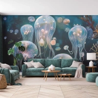 Fototapet Standard Eco - Lysande maneter som flyter i havets djup - 100x70cm - Undervattenbal - Modern väggdekoration för vardagsrum och sovrum ARTTOR
