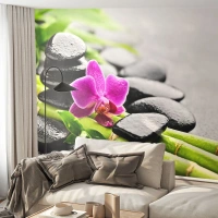 Fototapet Standard Eco - Orkidéblomma på en bakgrund av bambu och svarta stenar - 100x70cm - Lugn balans - Modern väggdekoration för vardagsrum och sovrum ARTTOR