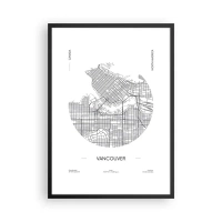 Affisch i svart ram - En minimalistisk svartvit karta över Vancouver - 50x70cm - Vacouvers anatomi - Modern väggdekoration för vardagsrum och sovrum ARTTOR