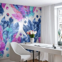 Självhäftande Fototapet Deluxe Sticker - Fjädrar i vitt och blått - Fågel fjäder, Färgglad Illustration, Grafik - 350x256 cm