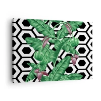 Canvastavla - Bild på duk - Tropiska löv på en geometrisk bakgrund - 70x50cm - Symmetrisk komposition från naturen - Modern väggdekoration för vardagsrum och sovrum ARTTOR