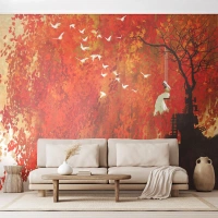 Fototapet Standard Eco - Höstillustration med ett träd, en gunga och fåglar - 100x70cm - Flyger hon med oss? - Modern väggdekoration för vardagsrum och sovrum ARTTOR