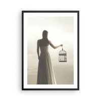 Affisch i svart ram - En kvinna med en bur mot ett dimmigt landskap - 50x70cm - Var fri - Modern väggdekoration för vardagsrum och sovrum ARTTOR