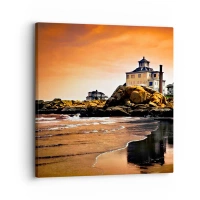 Canvastavla - Bild på duk - Ett hus på en klippa vid stranden i solnedgången med sin reflektion i vattnet - 70x50cm - Västkustens elegans - Modern väggdekoration för vardagsrum och sovrum ARTTOR