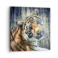 Glastavla - Bild på glas - En tiger i naturlig pose mot en rå vägg - 70x50cm - Porträtt i ljusstrålar - Modern väggdekoration för vardagsrum och sovrum ARTTOR