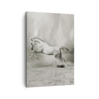 Canvastavla - Bild på duk - En vit häst i ett dynamiskt hopp mot bakgrund av dimmiga moln. - 70x50cm - Mellan dröm och sömn - Modern väggdekoration för vardagsrum och sovrum ARTTOR