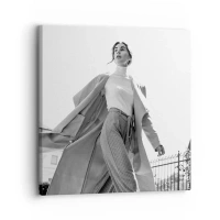 Canvastavla - Bild på duk - Snygg kvinna i kappa mot en svartvit arkitektonisk bakgrund - 70x50cm - Följer du med mig? - Modern väggdekoration för vardagsrum och sovrum ARTTOR
