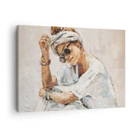 Canvastavla - Bild på duk - Porträtt av en kvinna med solglasögon mot en ljus vägg - 70x50cm - Porträtt i fullt solljus - Modern väggdekoration för vardagsrum och sovrum ARTTOR
